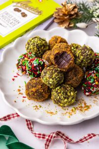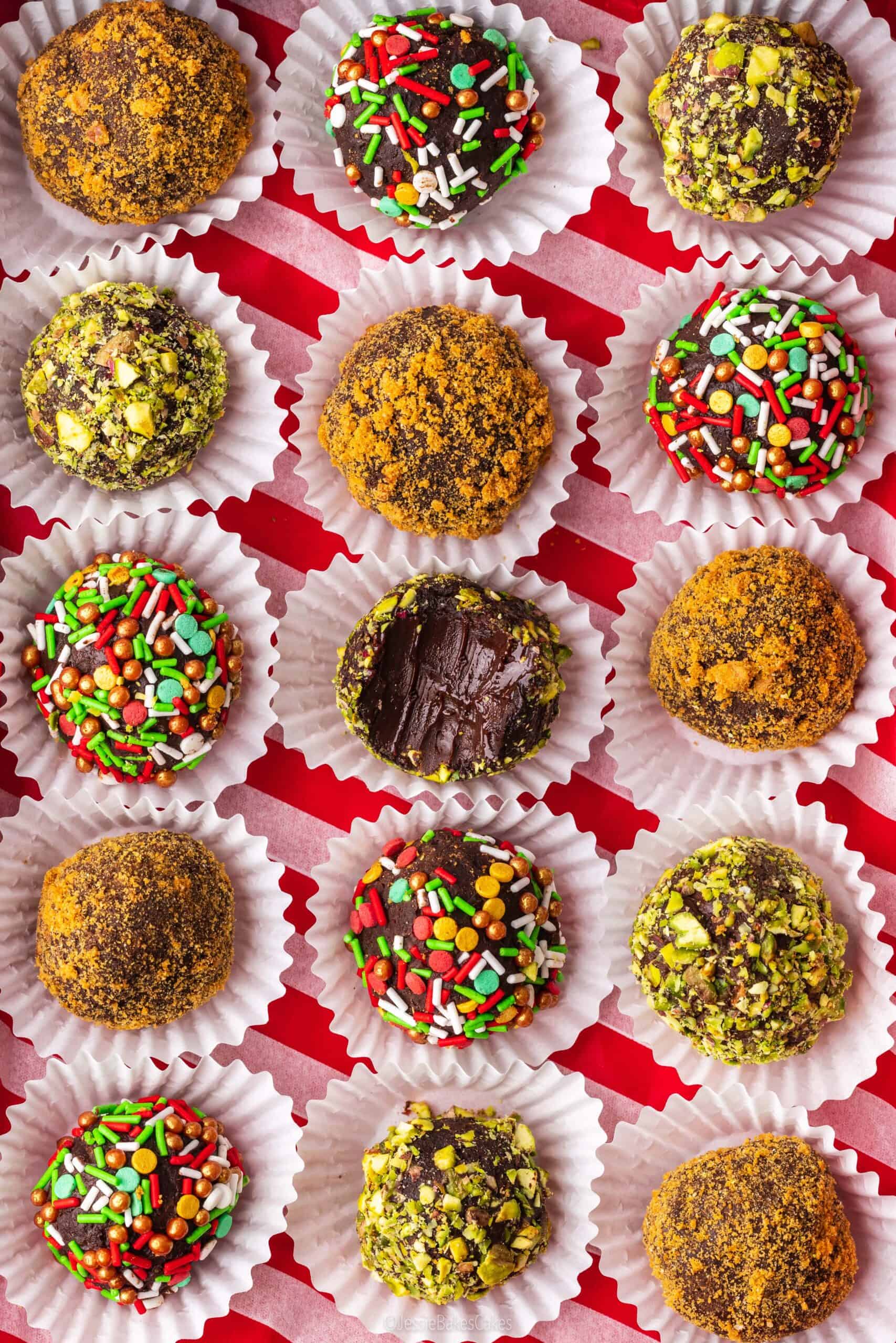 - Coating options: I decided on three different coatings for the chocolate truffles: chopped pistachios, Biscoff crumbs, and Christmas sprinkles. Or, keep things simple and lightly coat the truffles in cocoa powder.