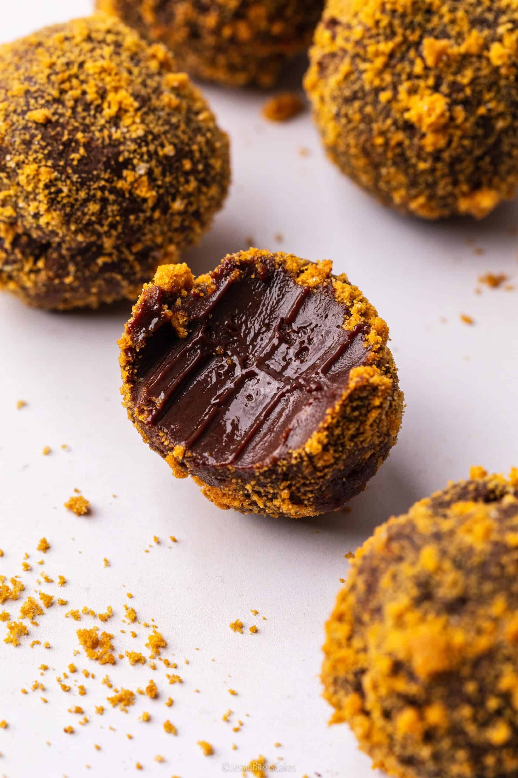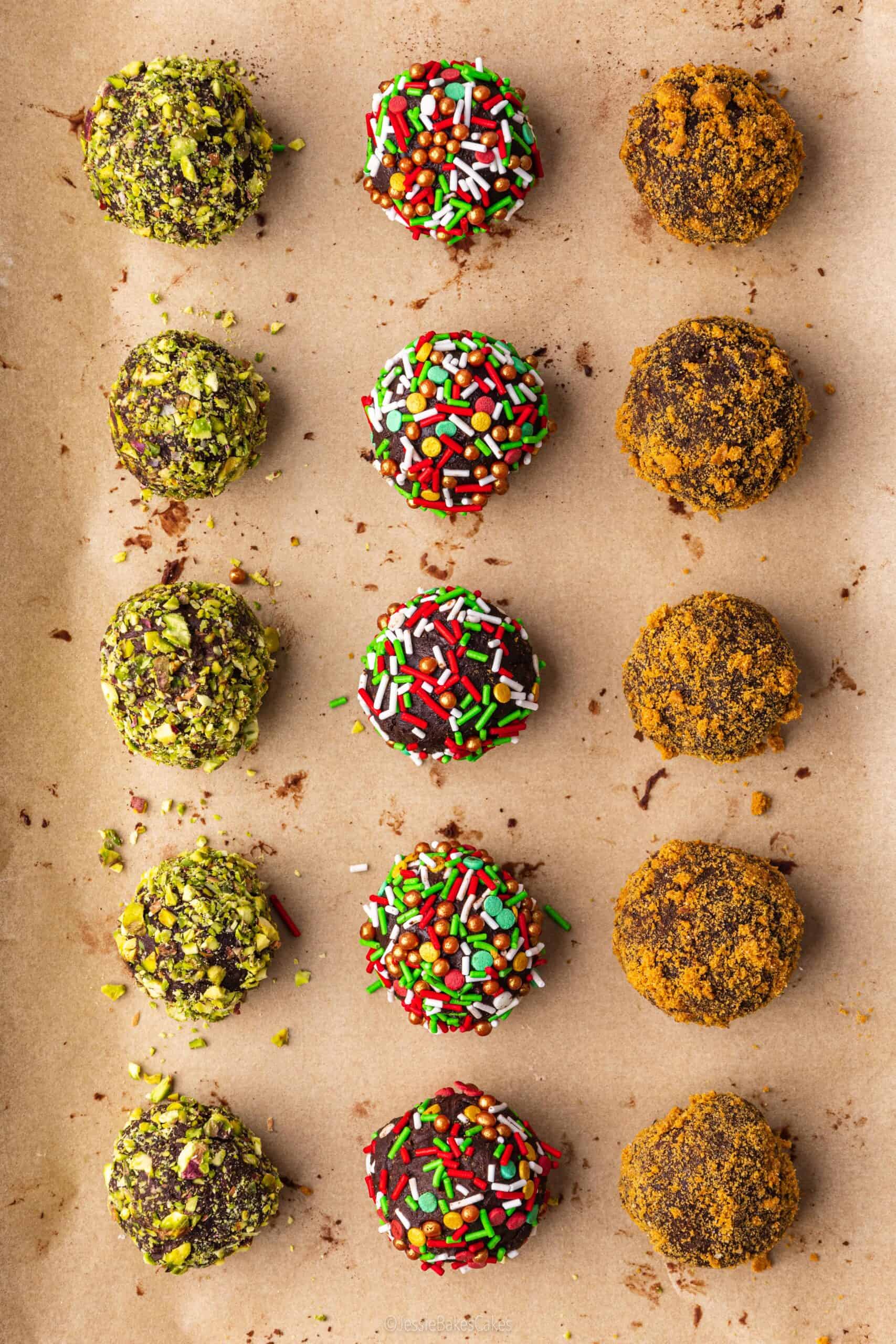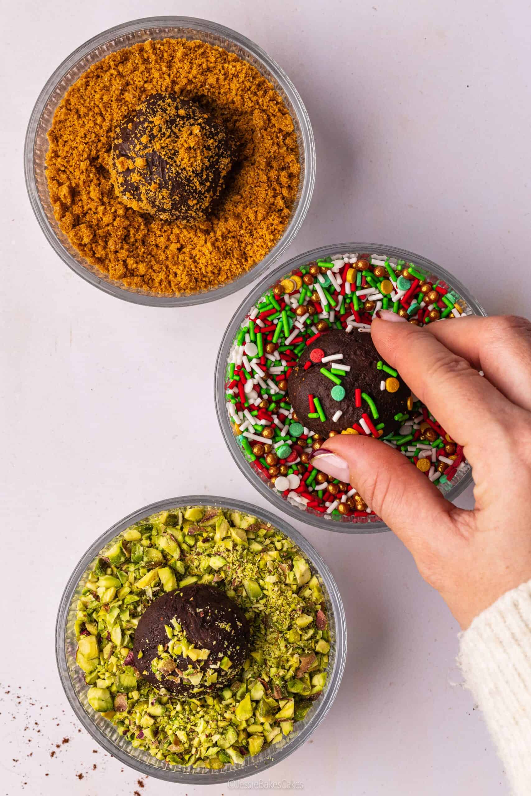 - Coating options: I decided on three different coatings for the chocolate truffles: chopped pistachios, Biscoff crumbs, and Christmas sprinkles. Or, keep things simple and lightly coat the truffles in cocoa powder.