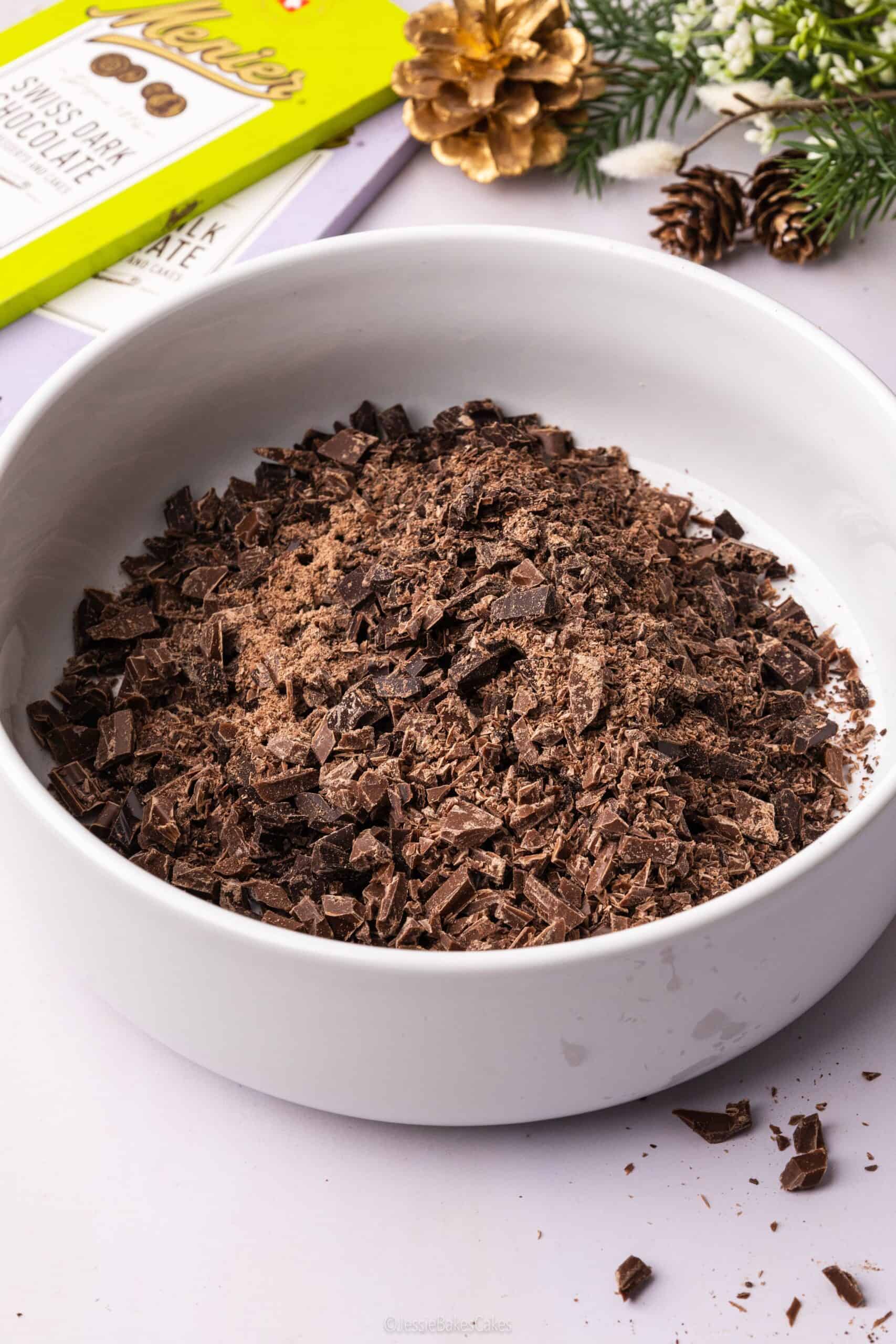 - Finely chop both the milk and dark chocolate into very small chunks. Place both in a large mixing bowl.150 grams Menier 70% Dark chocolate, 150 grams Menier Milk Chocolate