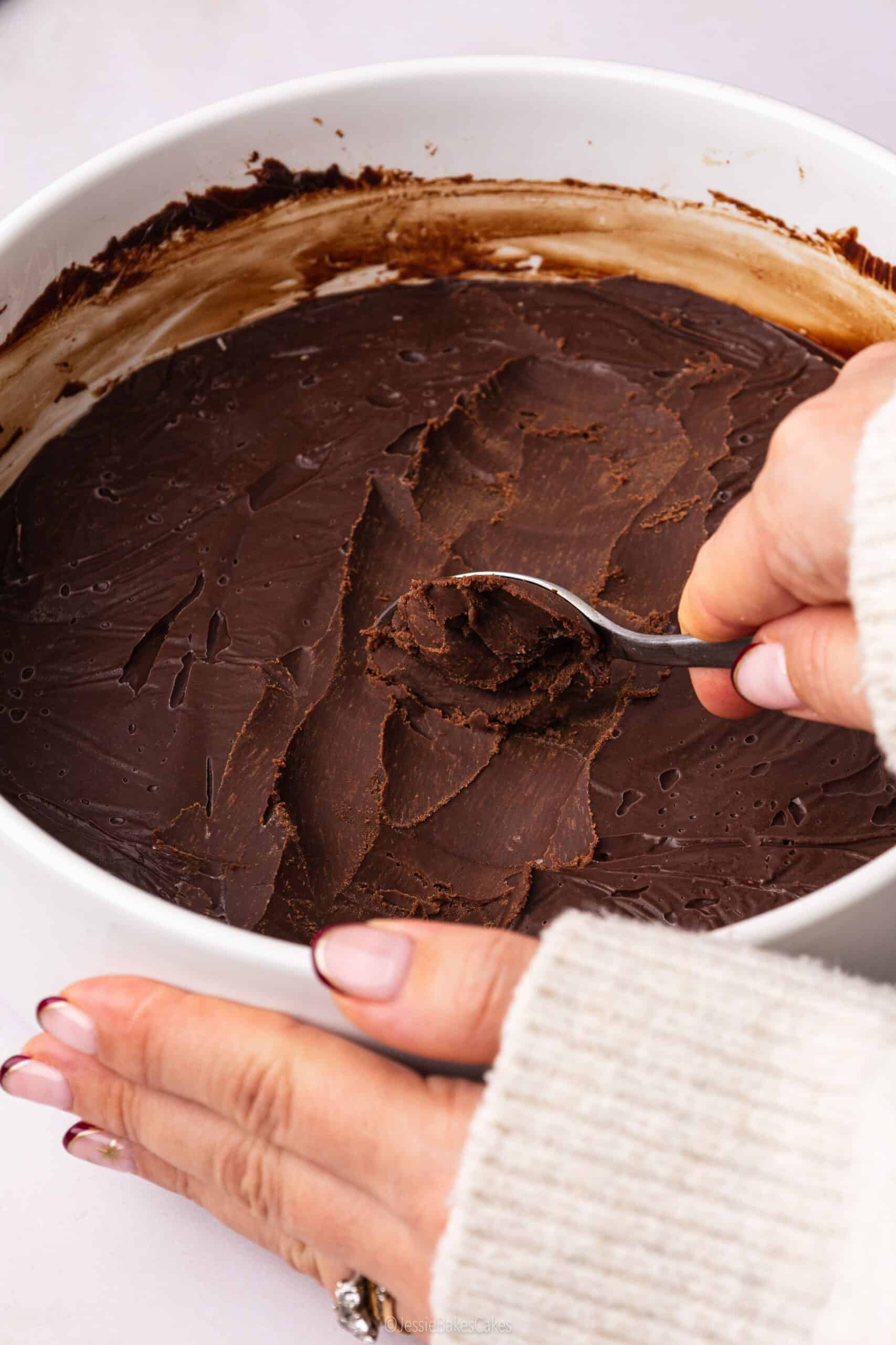 - Stir slowly until everything melts into a smooth, glossy ganache. TIP: Chocolate not fully melted? Pop the bowl in the microwave for 10 seconds and stir. Repeat if needed but be careful not to overheat the ganache.