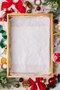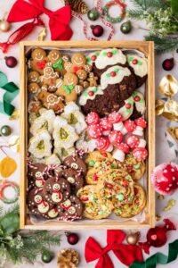 First things first, decide what cookies you want to include in your box! The fun part is mixing it up with different flavours, shapes, textures, and colours so every bite feels a little bit exciting. Think crunchy, chewy, chocolatey, nutty, colourful, and whimsical – you want a box that looks as good as it tastes. When it comes to how many types of cookies to include, it’s totally up to you. Go simple with two, keep it classic with four, or challenge yourself with a full-on festive selection of six to eight!