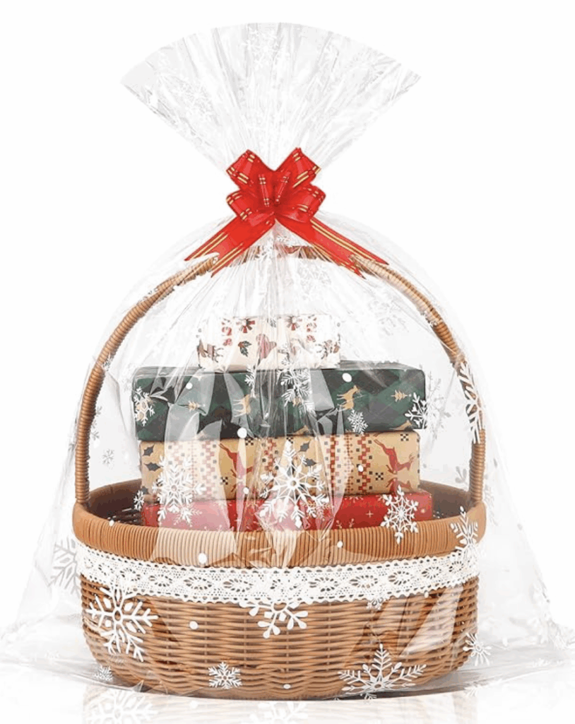 • Once everything’s in place, wrap the whole box in festive cellophane and tie with Christmas ribbon. Or you could keep it cute with candy cane twine.