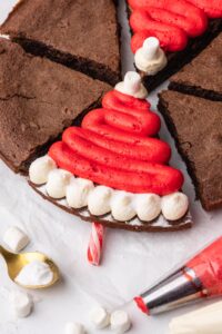 - For the Santa hat brownies: pipe blobs of white buttercream along the bottom and a blob at the top for the fluff. Scatter over white sprinkles or edible snow to add some texture. Pipe a swirl of red buttercream in the middle. Finish by adding a mini marshmallow at the top for the Santa hat bobble.3 Mini marshmallows