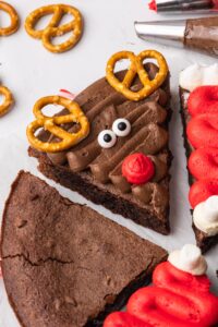 - For the reindeer brownies: Pipe a swirl of chocolate buttercream. Pipe a blob of red buttercream on top for Rudolph’s nose. Finish by adding pretzels for the ears and edible eyes.6 Pretzels, Edible eyes