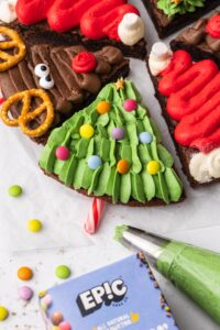 For starters, this recipe uses the Epic Double Choc Brownie Mix, which does all the heavy lifting on the ingredient front. No weighing, no faffing, no last-minute supermarket dash for cocoa powder. Simply tip the mix into a bowl, add melted butter and eggs, and you’ve got a double chocolate brownie batter ready in minutes. They bake quickly too, which means you can spend less time making the brownies and more time on the fun bit: turning them into your cute, festive Christmas designs. And if piping buttercream feels like more effort than you fancy (or you’re baking with little helpers), you can simply spread the buttercream on top instead. Or, pop the buttercream into zip lock sandwich bags, snip off the corner, and voilà: instant no fuss piping bags.