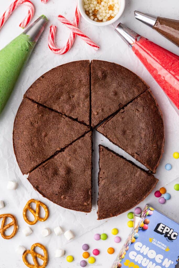 Right, your brownie is baked, cooled, and ready for its festive glow up! First things first, slice it into 6 triangles. The easiest way is to cut the round brownie in half, then make two diagonal criss-cross cuts. Grab some candy canes, snap them in half and stick them into the sides of the brownies for little sticks. Now let’s decorate: