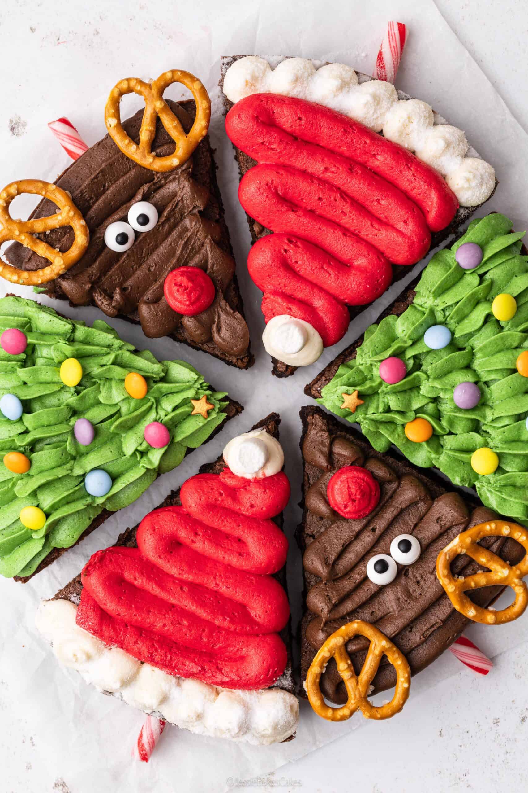 You don’t need anything fancy, just a few cute decorations will bring each brownie character to life. For the Christmas tree brownies, you’ll want some colourful sprinkles or chocolate beans to dot over your green buttercream trees. The star sprinkle for the top of the tree looks super cute too! For the Santa hat brownies, grab mini marshmallows for the little bobbles and some white sprinkles or edible snow for the fluffy trim. And for the reindeer brownies, you’ll need pretzels for ears, edible eyes, and a blob of red buttercream for Rudolph’s nose. Lay everything out before you start piping and you’ll be decorating like an pro!