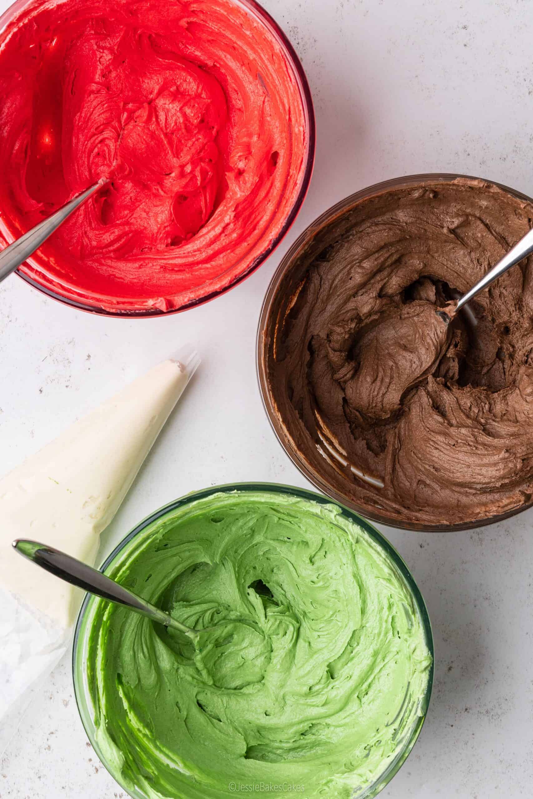 - Divide the remaining buttercream evenly between 3 bowls. Dye one red using food colouring, dye one green using food colouring, and flavour the third chocolate by mixing in the cocoa powder with a splash of hot water.2 tablespoons Cocoa powder, Green food colouring, Red food colouring