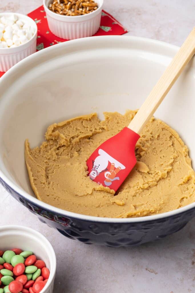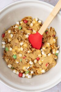 Now for the fun bit. Tip in your M&Ms, crushed pretzels, and mini marshmallows, and fold it all together. It should look like a Christmas party in cookie dough form.