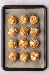 - Add the M&Ms (save a handful for decorating later), crushed pretzels and mini marshmallows. Fold into the cookie dough.120 grams Red and green M&Ms, 50 grams Salted pretzels, 50 grams Mini marshmallows