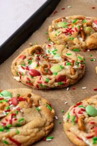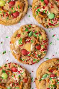 These Elf Mischief Munch Cookies are basically the Christmas version of a classic “everything but the kitchen sink” cookie – soft, chewy, and absolutely packed with mix-ins. The idea is simple: throw in anything fun lurking in your treat cupboard. Leftover Christmas chocolates? In they go. Crushed candy canes? Why not. Mini festive sweets? Elf-approved. The magic is in the balance, loads of sweetness with a hit of something salty, like pretzels or salted chocolate, to keep things from getting too sugary. This recipe uses M&Ms, mini marshmallows, salted pretzels and Christmas sprinkles for a colourful, crunchy, gooey mix that tastes like holiday chaos in the best possible way.
