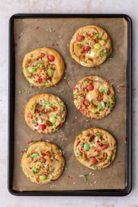 Right before baking, pour some Christmas sprinkles onto a plate and dunk each cookie dough ball into the sprinkles to coat the tops. The more sprinkles, the better! Bake these Elf Mischief Munch Cookies for 10 minutes at 180°C fan. The edges should look golden but the centres soft and slightly underbaked. That’s the sweet spot. As soon as they’re out of the oven, swirl a cutter around the cookies to make them perfectly round and squish a few extra M&Ms into the top. Then allow the cookies to cool for at least 30 minutes.