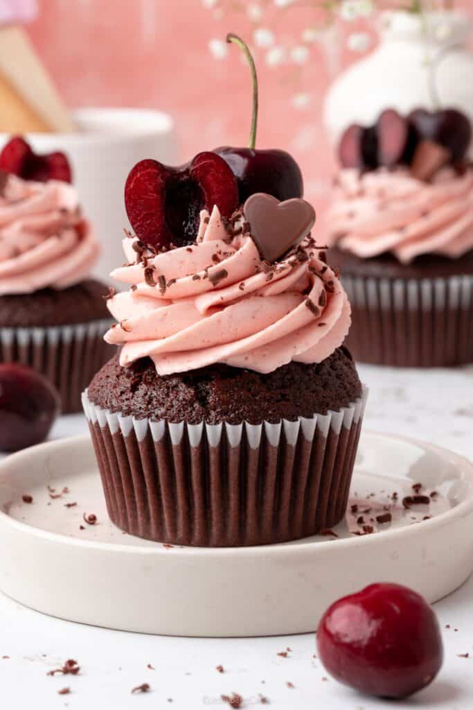 This is where you can get creative! Decorate your cupcakes with your favourite Valentine’s sweets, chocolates or edible treats. I opted for a light sprinkle of grated dark chocolate, half a cherry for a pop of ruby red colour, a whole cherry to add some height, and a small chocolate heart. Now enjoy your beautiful Cherry Mocha Cupcakes!
